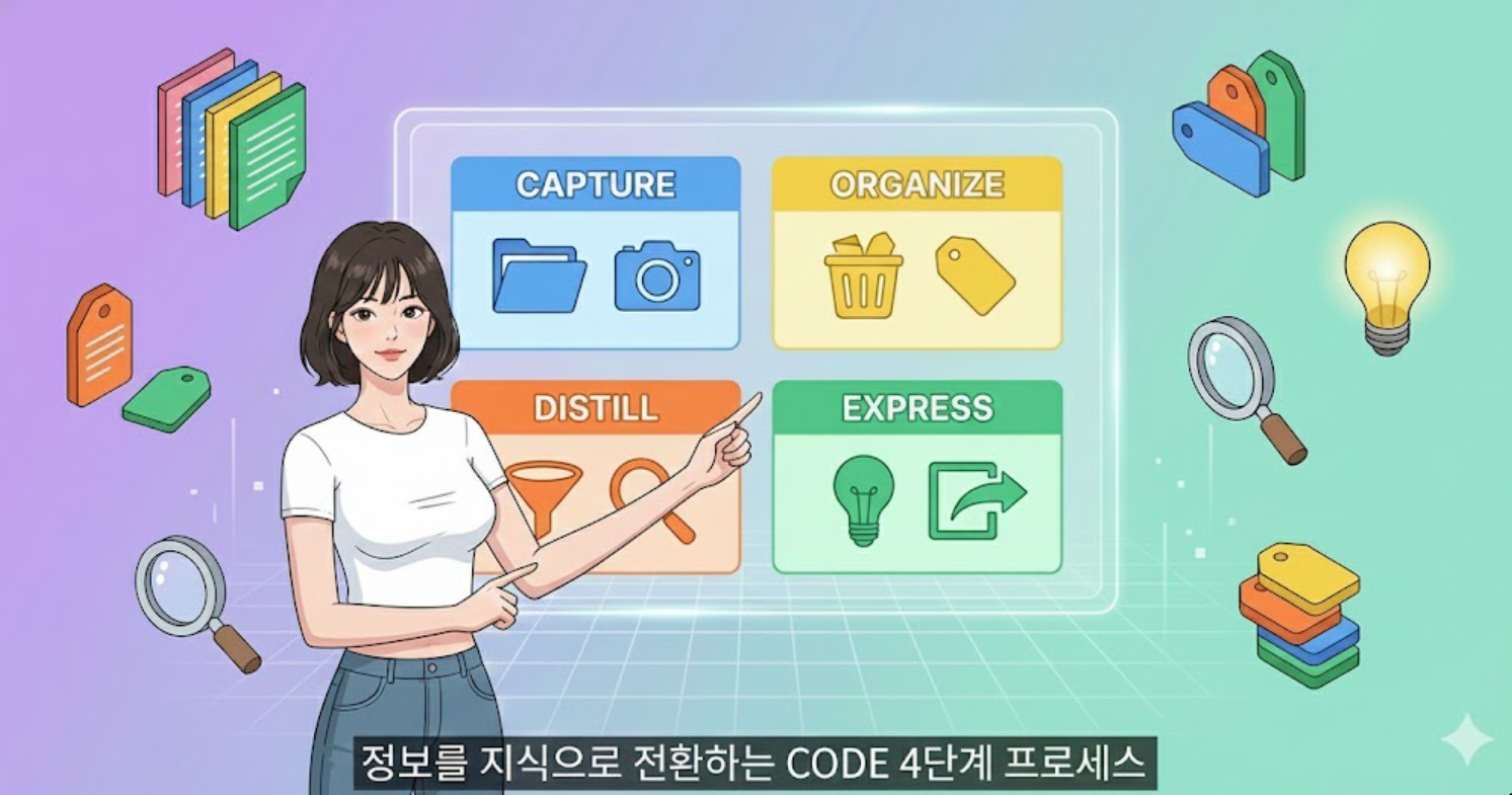 티아고 포르테가 제안한 CODE는 Capture(수집), Organize(정리), Distill(추출), Express(표현)의 4단계로 구성된 정보 관리 프레임워크입니다. 이 시스템을 노션에서 실천하는 구체적인 방법을 알아봅니다.