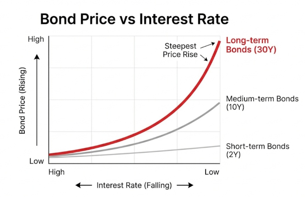 금리가 떨어지면 채권 가격은 오릅니다. 이것은 경제학의 불변의 법칙입니다. 특히 만기가 긴 장기채일수록 금리 하락 시 가격 상승 폭(듀레이션 효과)이 큽니다.