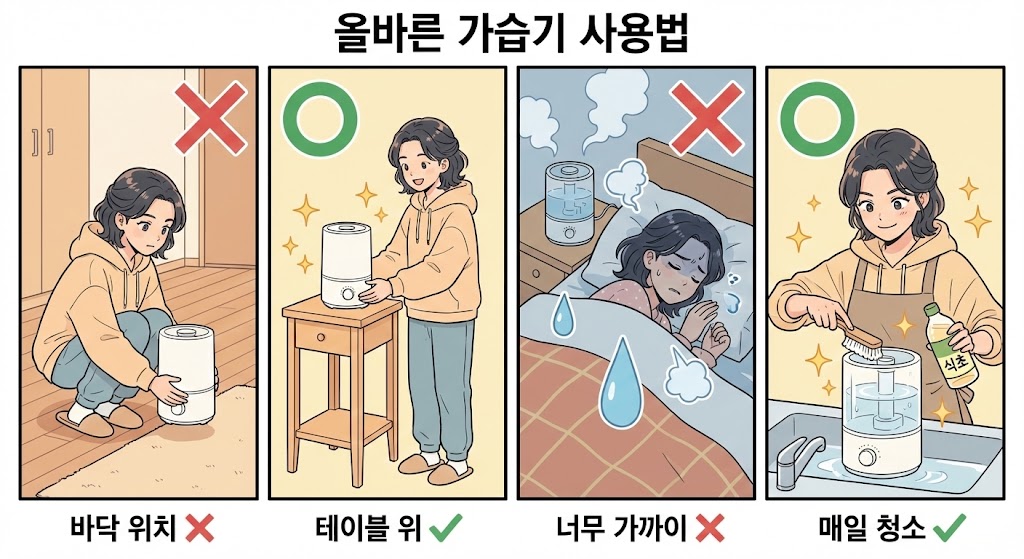 특히 머리맡에 가습기를 가까이 두는 것은 최악의 선택입니다. 찬 수증기가 직접 코 점막에 닿으면 기침이나 가래를 유발할 수 있거든요.