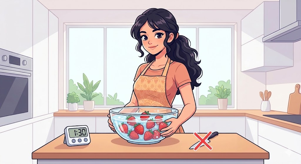 2 비타민C가 물에 녹아 사라집니다 딸기의 핵심 영양소인 비타민C는 수용성입니다. 코팅(껍질)이 벗겨진 단면으로 비타민이 빠르게 유출되어, 영양가 없는 '설탕 물'만 먹게 될 수 있습니다.