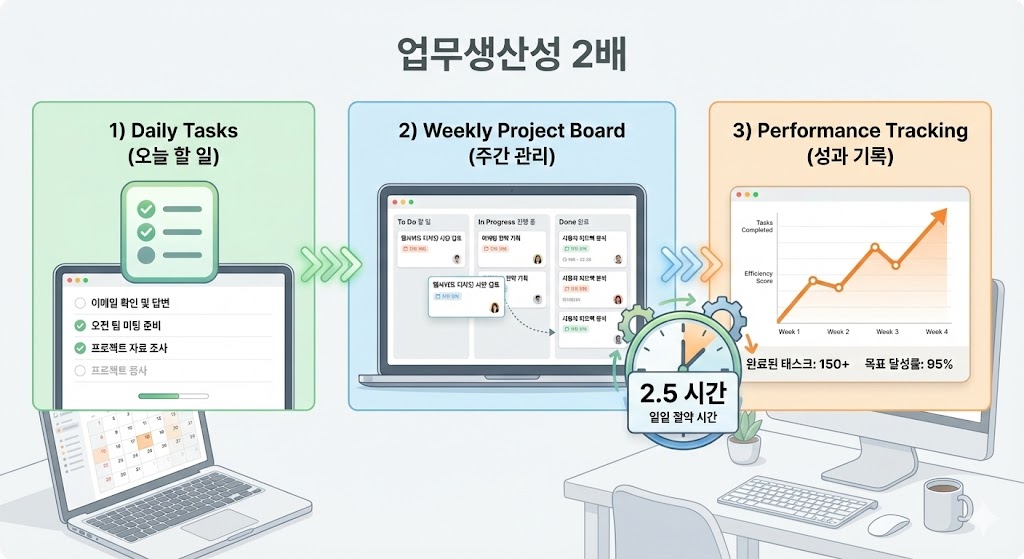 단지, '해야 할 일'을 명확하게 정리하고, '진행 중인 일'을 가시화하며, '완료된 성과'를 기록하는 행동입니다. 이 3가지만 해도 당신의 업무 생산성은 지금의 2배가 됩니다.