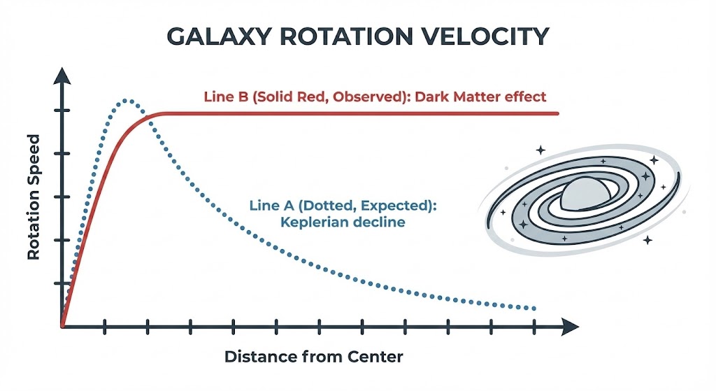 보이지 않는데 어떻게 존재를 확신할까요? 첫 번째 증거는 **은하의 회전 속도**입니다.