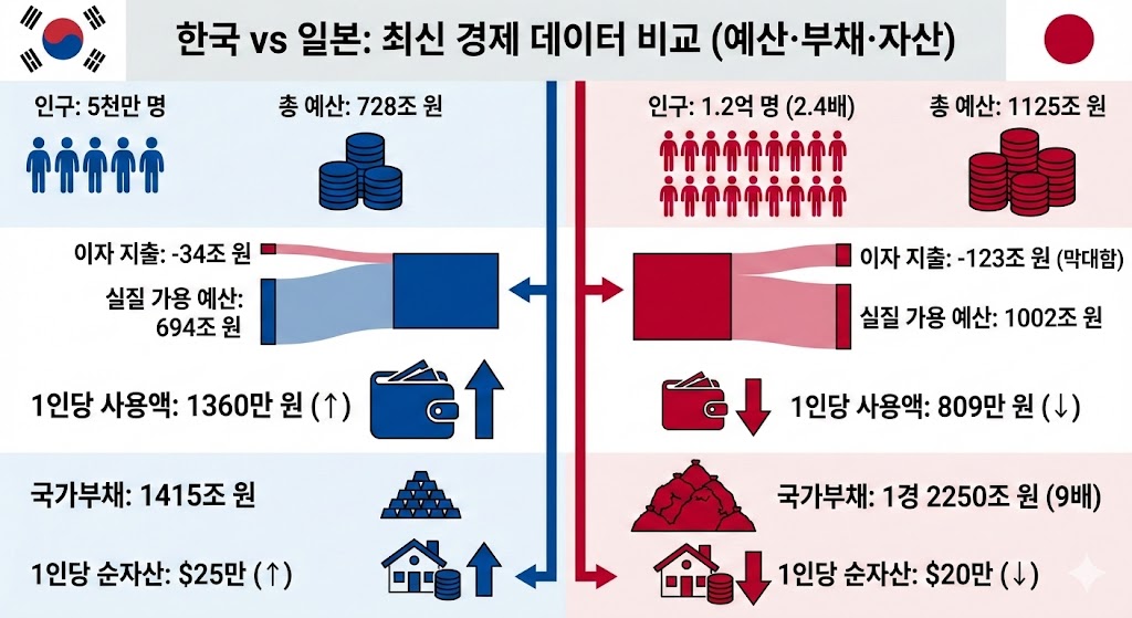 일본은 막대한 국가 부채로 인해 연간 이자로만 약 123조 원을 지출하고 있습니다. 반면 한국은 34조 원 수준입니다. 이자를 떼고 나면 양국의 예산 격차는 더욱 좁혀집니다.
