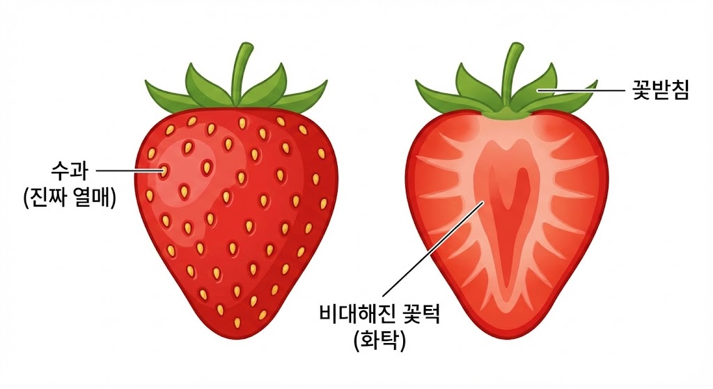 충격적인 사실은, 겉에 박힌 깨알 같은 씨앗이 식물학적으로 '진짜 열매'이고, 우리가 맛있게 먹는 빨간 과육은 꽃받침이 커진 '가짜 열매(헛열매)'라는 점입니다.
