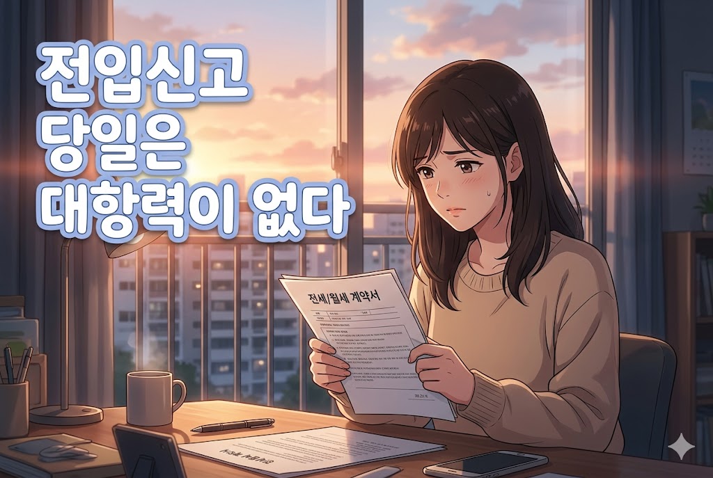 핵심은 대항력 발생 시점에 있어요. 주택임대차보호법 제3조 제1항에 따라 대항력은 주택 인도 + 전입신고 완료 다음날 0시에 발생합니다. 잔금을 치르고 전입신고를 마친 당일 오후에도, 법적으로는 여전히 '대항력 없는 상태'예요.